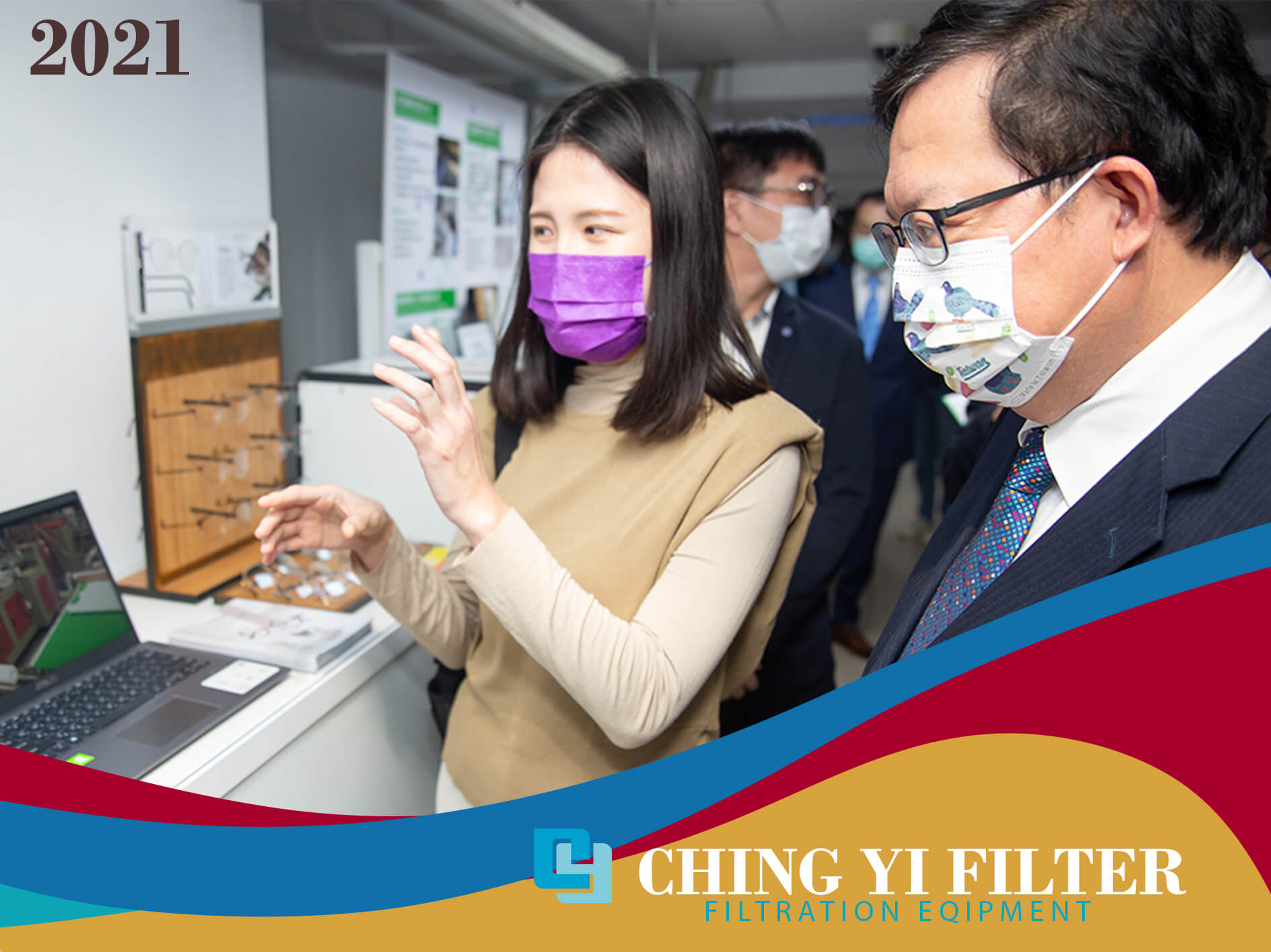 桃園市政府經濟發展局今天在市府綜合會議廳舉行地方產業創新研發推動計畫(地方型SBIR)」成果發表會,由市長主持 慶邑推出自製研發<骨架型多密度濾材製成機械>此設備能取代傳統聚丙烯纖維濾材,並取代人工裝填。